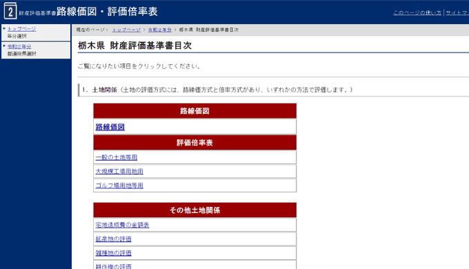 これが、令和2年分の栃木県の財産評価基準書の目次ページです。